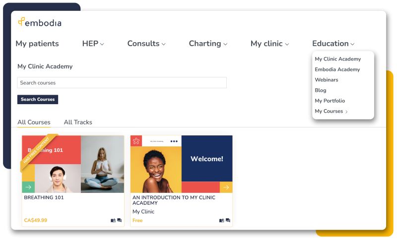Embodia offers clinics and organizations two optional add-ons. Private Academy, a branded learning management system (LMS) to host private online courses for their team. Clinic Academy, a branded LMS to host and sell courses and/or memberships to patients and the general public.