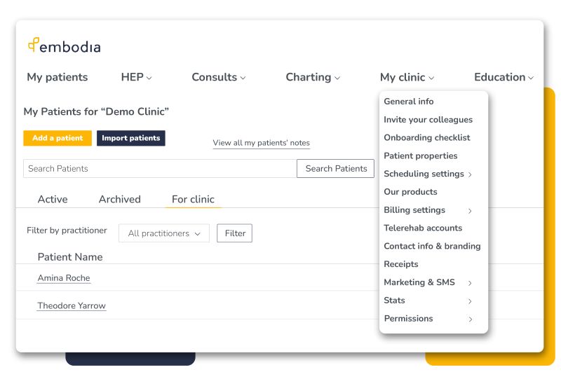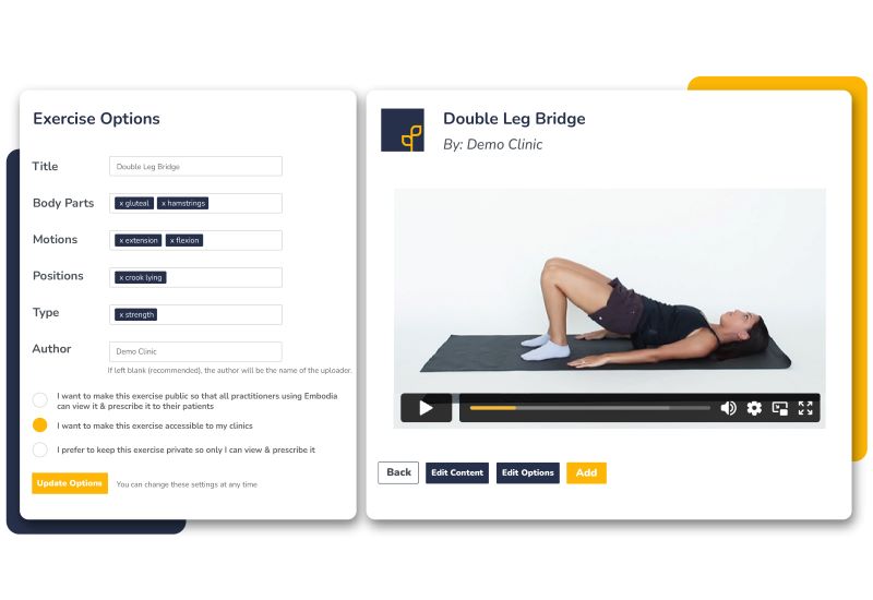 Clinics using Embodia for HEP have additional features. Clinics can build libraries of exercises and patient education (that are private to the clinic), share patient profiles, and collaborate on patient programs.