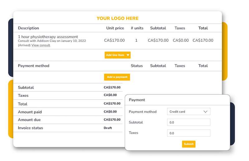 Send invoices, collect payments, and view unpaid invoices from one simple dashboard. Add unlimited payment methods and collect credit card payments directly in Embodia by connecting your Stripe account. Canadian practitioners can submit Health Claims for Auto Insurance (HCAI), GreenShield providerConnect claims, and TELUS eClaims directly. Plus, Superbills are included for all US practitioners.