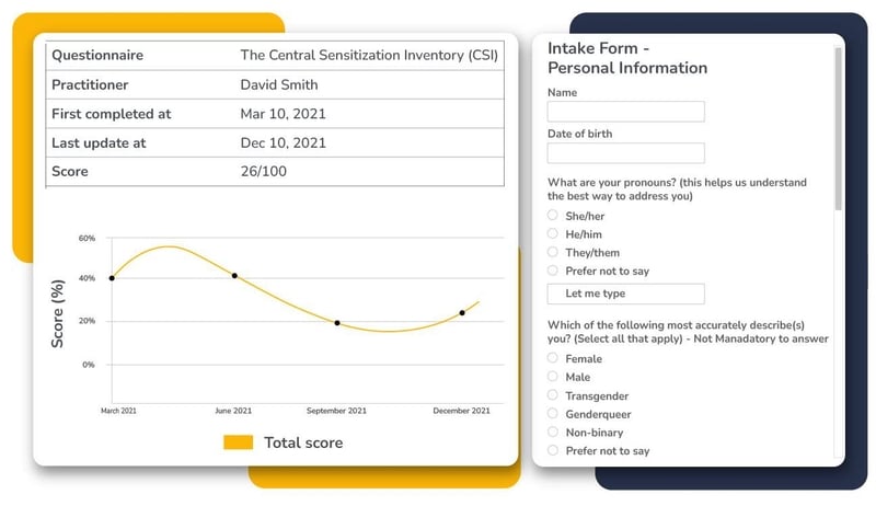 Draw from Embodia’s database of outcome measures and questionnaires, including intake forms and diaries, or create your own. Patients complete questionnaires digitally, on their own or in collaboration with their therapist. Outcome measures can be automatically scored and tracked over time.