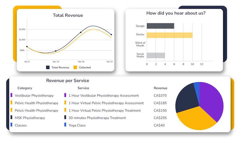 Robust reporting dashboards provide you with critical information to manage and understand your practice. Reports include revenue, discharge reports, clients who haven’t rebooked, utilization rate, and more! Clinics can also build their own custom reports and compare reports across different time periods.