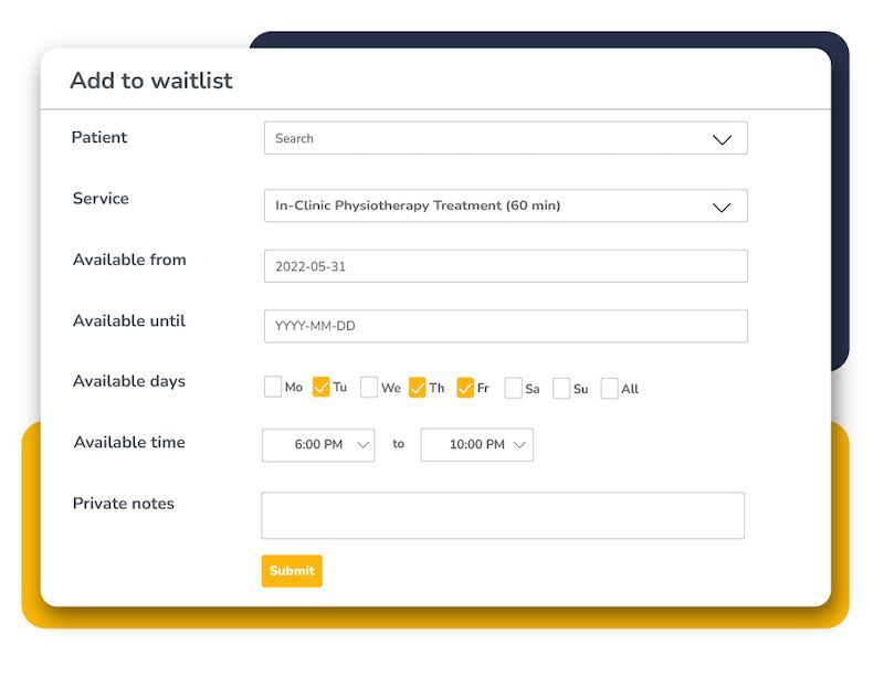 Embodia's comprehensive waitlist feature lets you quickly and easily notify patients of a cancellation that matches their availability. Add your waitlist to online booking to allow patients to book directly into your waitlist..